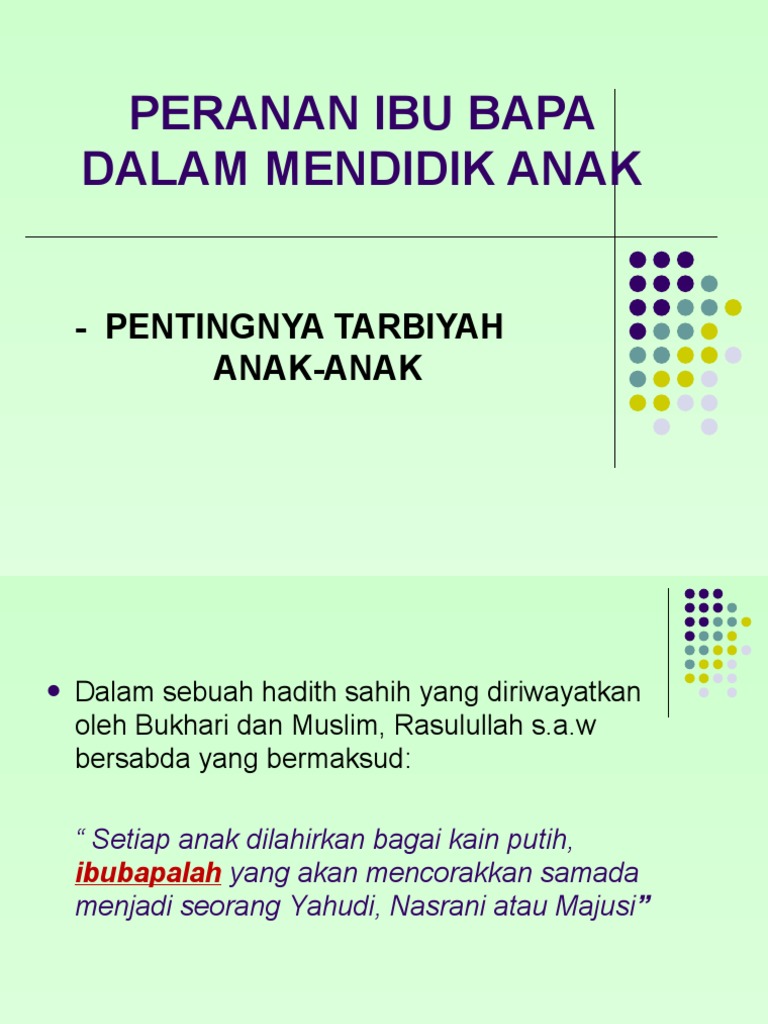 Dibawah merupakan peranan ibu bapa dalam membesarkan anak-anak. Anak-anak ibarat kain putih ibu bapalah yang menetukan coraknyaMemetik sabda Nabi Muhammad SAW jelaslah membuktikan bahawa ibu bapa memainkan peranan yang penting dalam mendidik anak-anak. Pesanlah pada anak-anak untuk menyimpan hand phone dan gajet masing-masing buat sementara waktu.